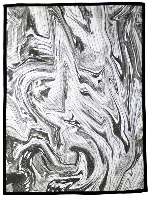 Abstract design in black and white. Geometric design generated from manipulating and stretching pixels. Digitally printed heavy cotton twill. Quilted.
