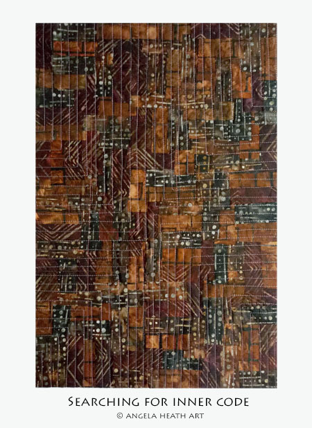 The 1st and 2nd work in the Tales from the Innervision quilt series, Searching for Inner Code represents the inner work that every person goes through to discover their own “code”. Notice that in the 1st one, the thread is less pronounced and blends into the “coded” background. In the 2nd one, the thread is more pronounced as you begin to discover the essence of who you are.