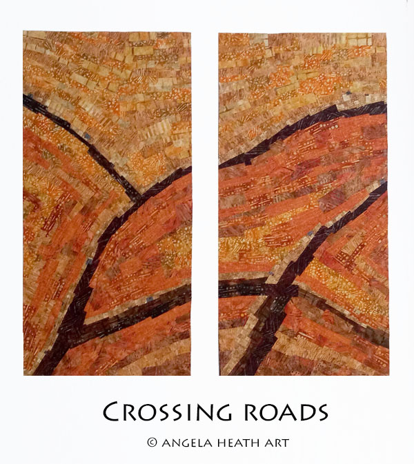 The 4th work in the Tales from the Innervision quilt series, Crossing Roads is the personal discovery of the terrain of life. Like traveling over different terrains, life’s journey consists of crossing many roads that are full of turns, ups, downs, stops, starts, rough patches and smooth ones.