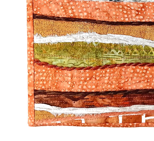 This quilt uses 20 different pieces of fabric – commercial cottons, raw silks, upholstery and my own hand-dyed and digital fabric. Pieces are cut leaving raw edges and then carefully positioned on a whole piece of interfacing to form the mosaic top. The quilt sandwich is the mosaic top, organic acrylic felt and backing cotton fabric. The sandwich is sewn together using cotton thread and then binded with mitered corners.