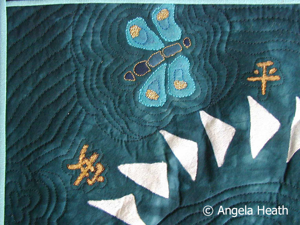 This quilt uses 20 different pieces of fabric – commercial cottons, raw silks, upholstery and my own hand-dyed and digital fabric. Pieces are cut leaving raw edges and then carefully positioned on a whole piece of interfacing to form the mosaic top. The quilt sandwich is the mosaic top, organic acrylic felt and backing cotton fabric. The sandwich is sewn together using cotton thread and then binded with mitered corners.