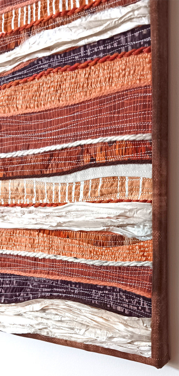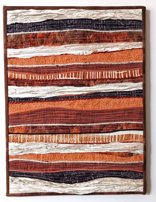 Earth Moving is my latest work from my Earth Series. It is 18″w by 24″h stretched around canvas. It contains the “Earth” fabrics along with silk ribbons.