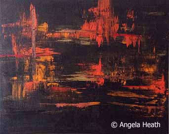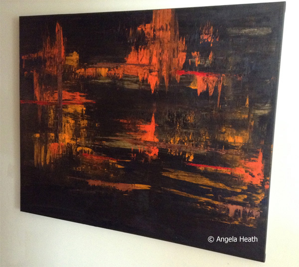 PAINTINGS_Lost-City_2017 Lost City Surface Design Series 30″w by 24″h Abstract design depicting a city in turmoil with a black background. 2017 Another picture on the wall: Closeup view… Another close up view…