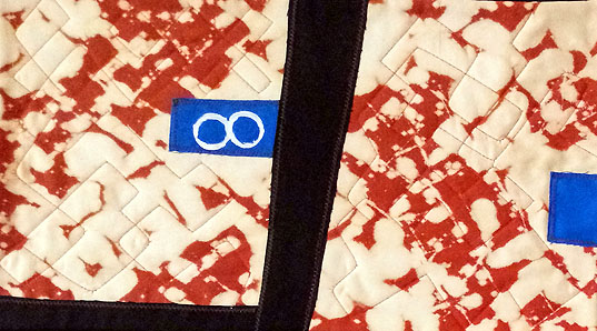Abstract discharged fabric. Original design representing unity in the foreground with chaotic shapes in the background. Quilted with cotton and metallic threads.
