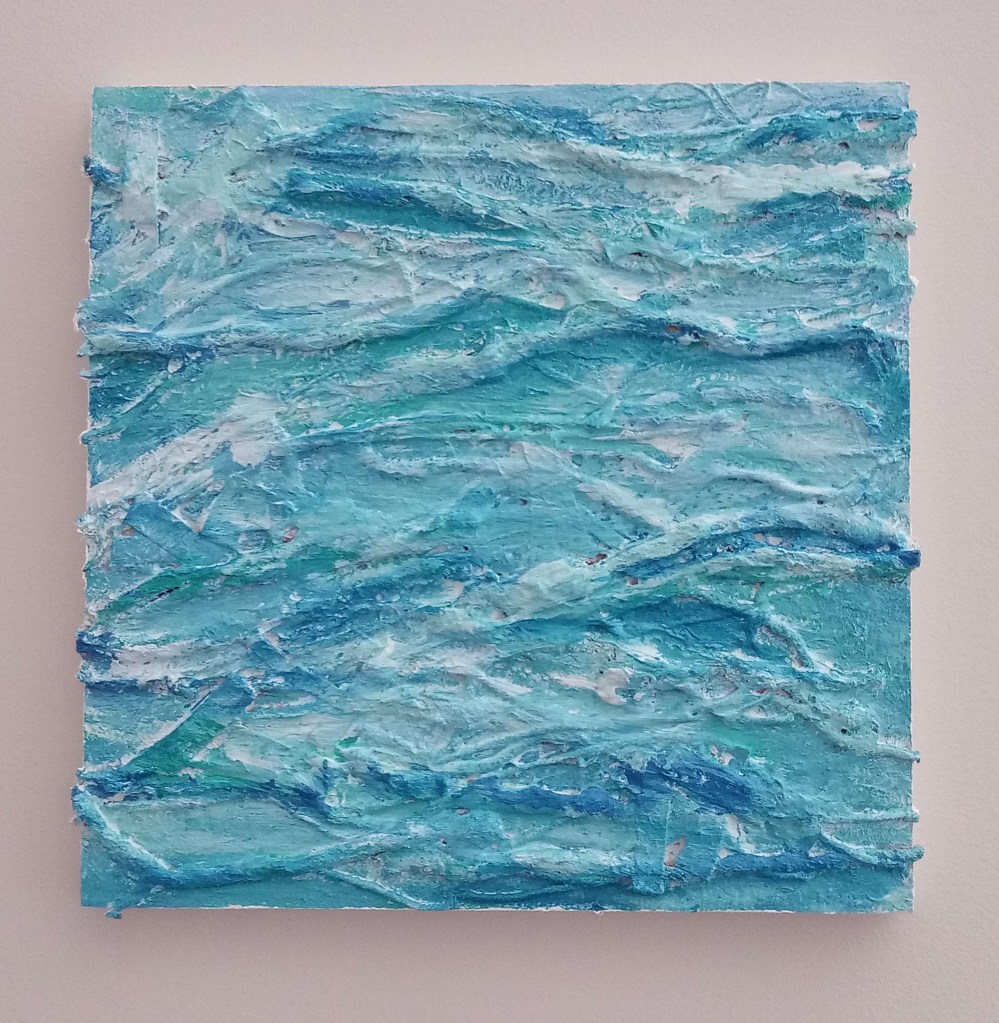 PAINTINGS, Water Series, 2020, Fiber and paper textured with gesso, acrylics and inks on wood, blue, white