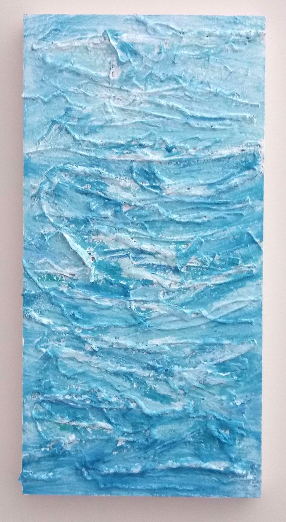 Ocean Water Waste depicts the huge problem of ocean or marine littering. I have made quite a few water paintings as water and land are my favorite earth elements. These three pieces are beautiful like our real oceans in spite of the litter dumped on them. This reminds me of our human spirit. Even when we are dumped on (esp. in pandemic times), our essence is still exquisitely beautiful.