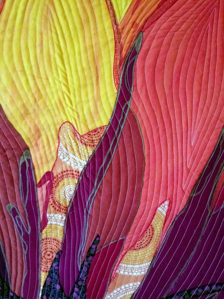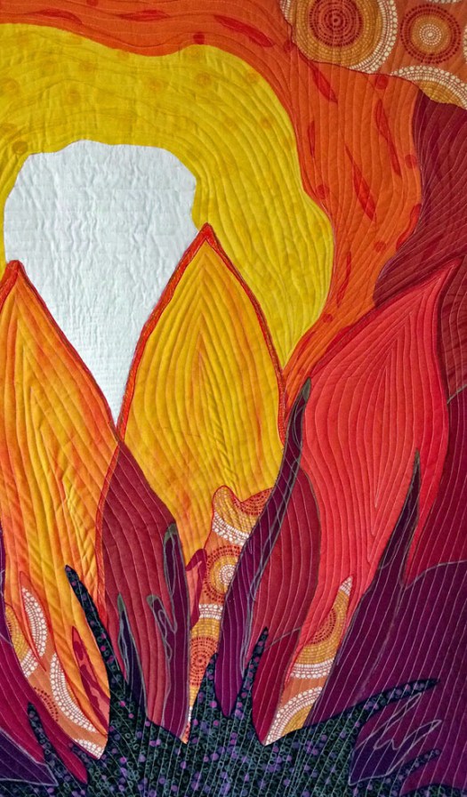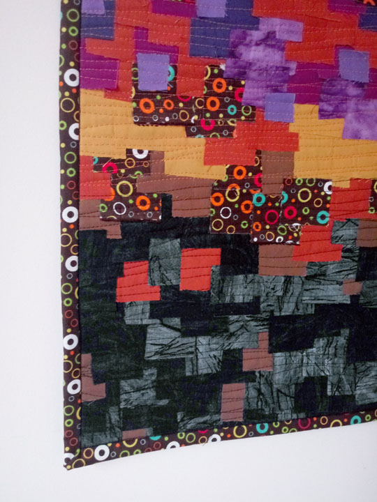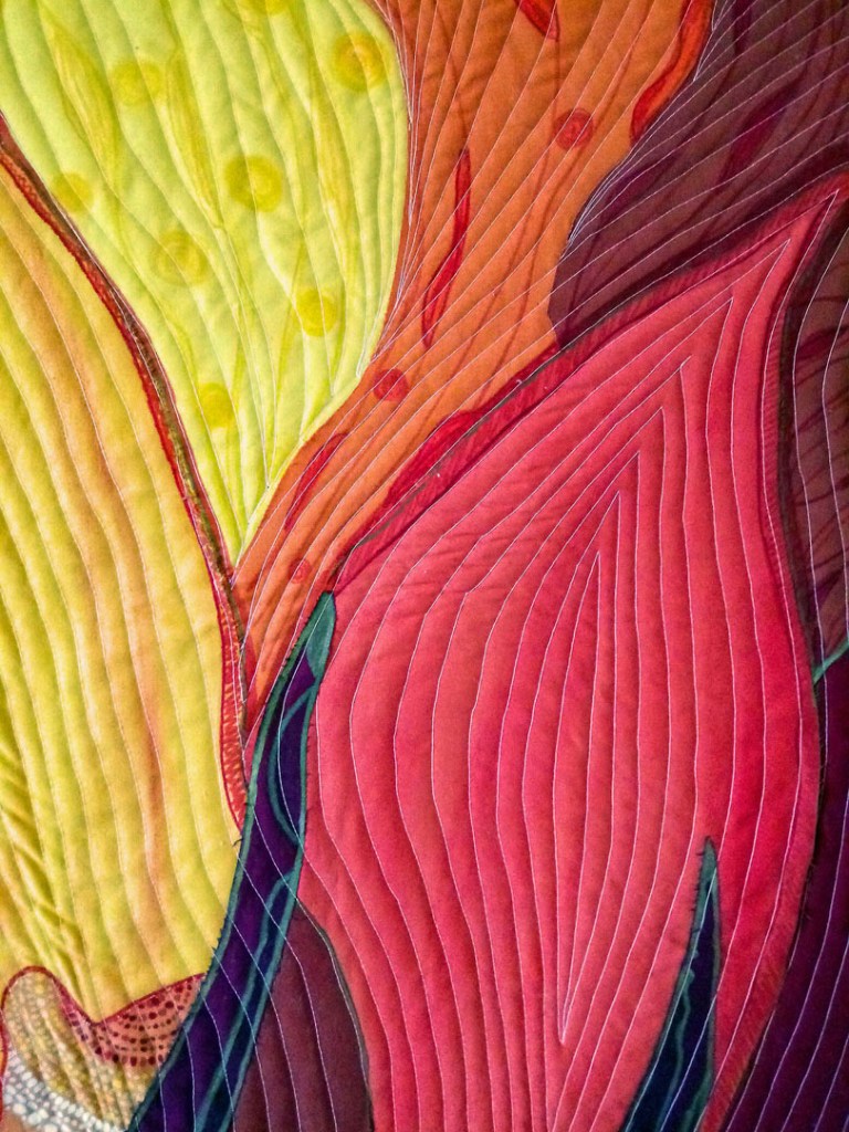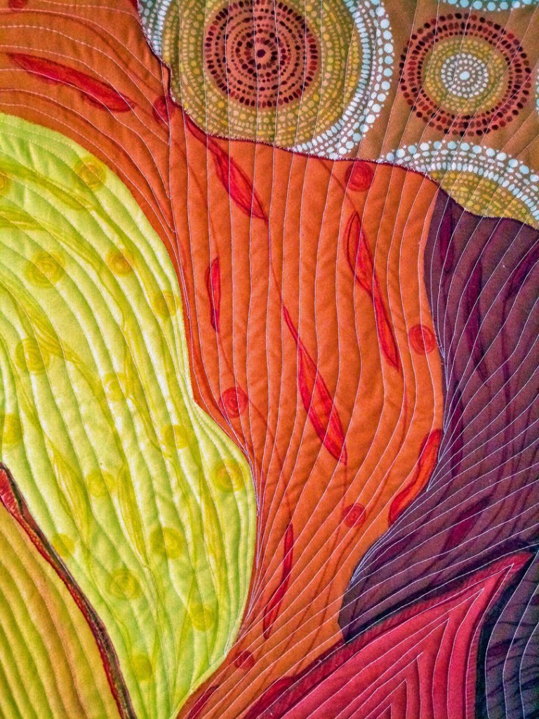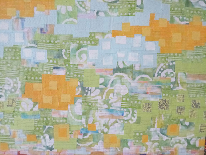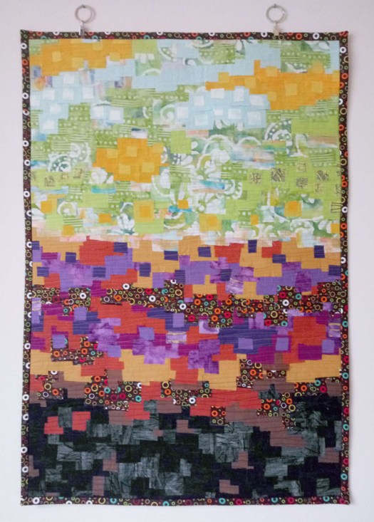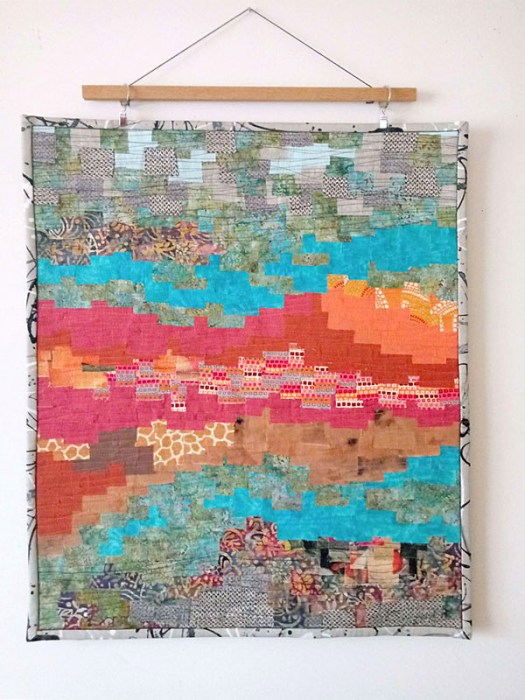 This quilt uses 27 different pieces of fabric – commercial cottons, raw silks, and my own digital fabric. Pieces are cut leaving raw edges and then carefully positioned on a whole piece of interfacing to form the mosaic top. The quilt sandwich is the mosaic top, organic acrylic felt and backing cotton fabric. The sandwich is sewn together using cotton thread and then binded with mitered corners.