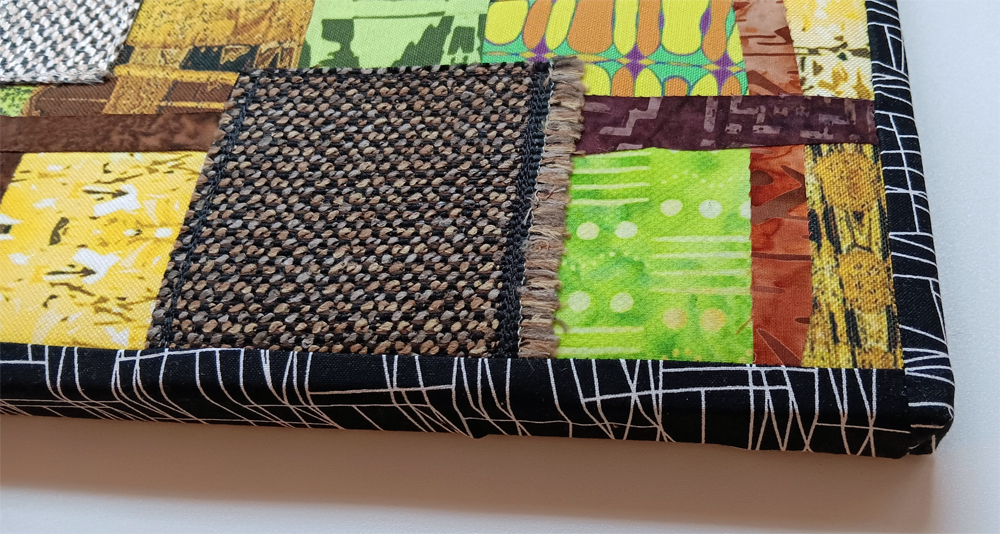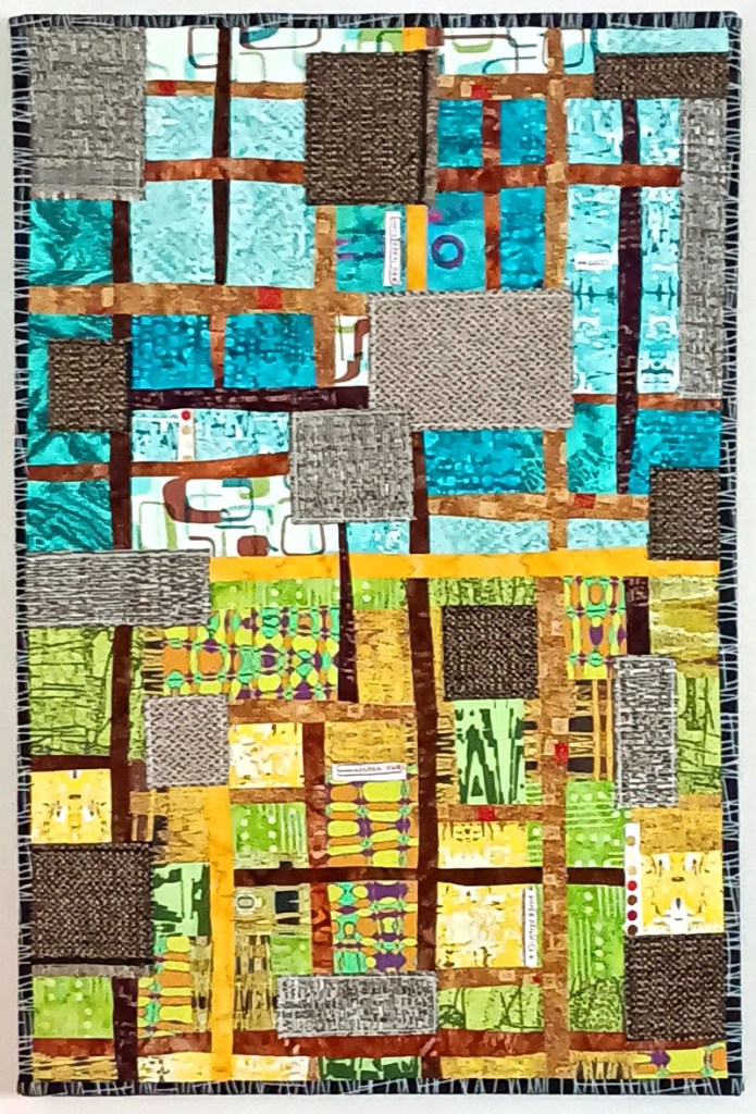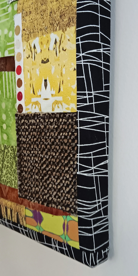 The resulting work is this 20″ x 30″ geometric piece. To me, this collage represents the self-reflective power of fabric. The colors, patterns and textures positioned as segments and whole pieces that make up the fabric of ourselves.